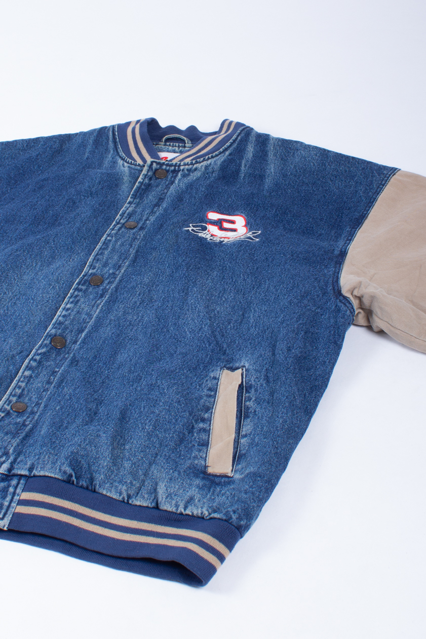 Men’s authentic vintage NASCAR Dale Earnhardt Jr. varsity jacket in blue denim and beige sleeves. Embroidered patches on front, back and sleeves.